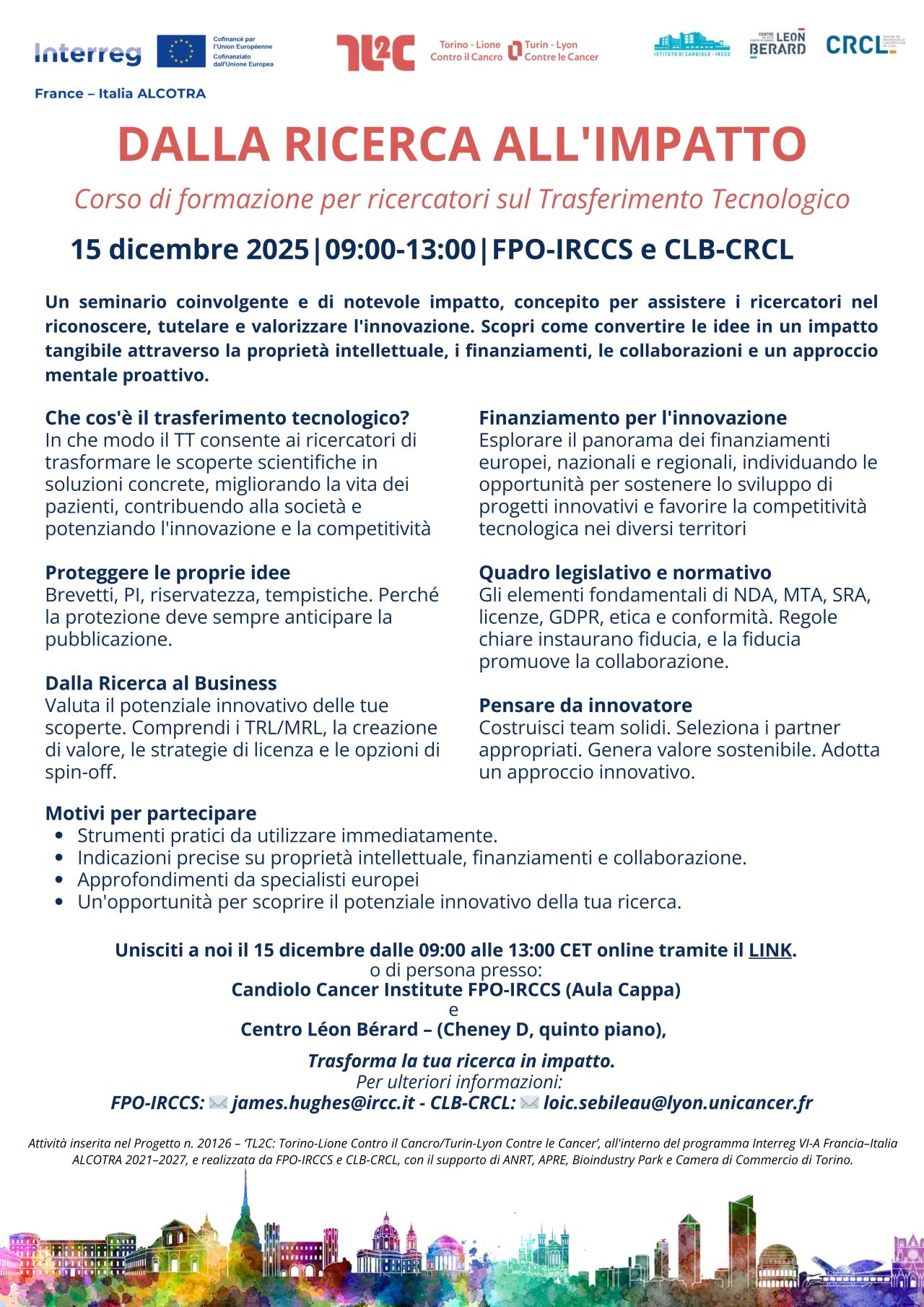 Si è svolto ieri, 15 dicembre 2025, un seminario sul Trasferimento Tecnologico dal titolo “From Research to Impact – Technology Transfer Course for Researchers”, organizzato congiuntamente dalCandiolo Cancer Institute IRCCS(FPO-IRCCS) e dalCentre Léon Bérard– CRCL di Lione con il prezioso contributo dei Partner Associati di progetto.